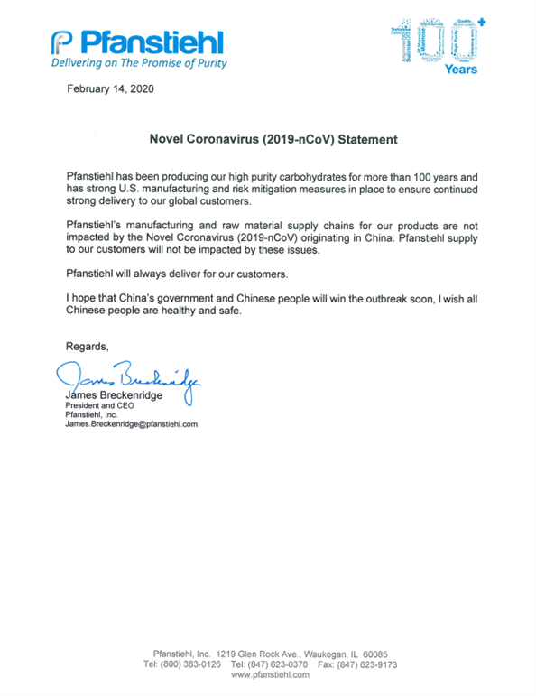 新型冠狀病毒肺炎 (COVID-19) 疫情已發(fā)展為影響全球的公共衛(wèi)生事件,隨著我國開啟全面的復工復產(chǎn),我們的供應商Pfanstiehl承諾將一直保持產(chǎn)出并保障供應全球客戶。