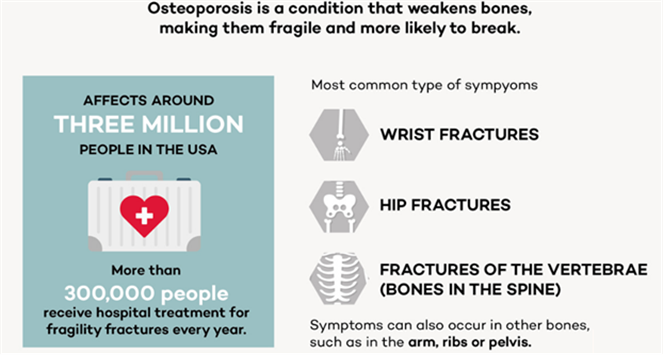 骨質(zhì)疏松癥是一種以骨密度降低為特征的肌肉骨骼系統(tǒng)疾病。肌肉骨骼系統(tǒng)是由骨骼、肌肉和相關(guān)元素,如軟骨、結(jié)締組織和關(guān)節(jié)所組成。它為身體提供形態(tài)、支撐和穩(wěn)定性,并使其運(yùn)動(dòng)。骨密度的降低會(huì)導(dǎo)致骨骼的收縮,從而會(huì)導(dǎo)致骨骼變得脆弱,增加骨折的風(fēng)險(xiǎn)。