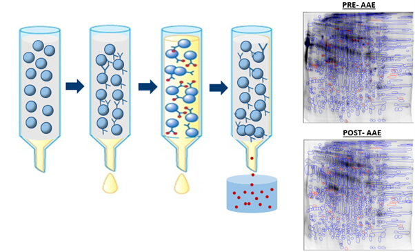 2014年,作為過程污染物殘留檢測(cè)產(chǎn)品領(lǐng)先開發(fā)商,Cygnus結(jié)合多年HCP抗體及試劑盒開發(fā)經(jīng)驗(yàn),推出了Affinity Antibody Extraction(AAE)方法驗(yàn)證覆蓋率,突破了傳統(tǒng)2DWB方法驗(yàn)證覆蓋率的局限性,更真實(shí)準(zhǔn)確反應(yīng)HCP抗體覆蓋率。AAE提取富集的樣品和未經(jīng)AAE提取的樣品分別經(jīng)過2D PAGE分離后使用銀染的方法對(duì)得到的點(diǎn)進(jìn)行匹配、計(jì)數(shù)、計(jì)算覆蓋率。這種方法一經(jīng)上市后,廣泛得到生物制藥企業(yè)和監(jiān)控部門的認(rèn)可。