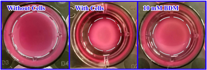 根據(jù)實(shí)驗(yàn)方案(上圖),虛線表示凝膠邊緣,用尺子分別測(cè)量無(wú)細(xì)胞組、有細(xì)胞組和10mM細(xì)胞收縮抑制劑BDM處理組的膠原基質(zhì)的直徑(單位:mm),對(duì)比BDM處理組與對(duì)照組細(xì)胞收縮的變化。