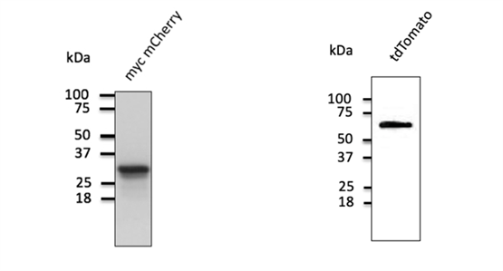 ? ? 西美杰代理SICGEN品牌提供的Anti-mCherry和Anti-tdTomato均為從圓盤珊瑚中提取的紅色熒光蛋白的多克隆抗體。Anti-mCherry和Anti-tdTomato兩種抗體的抗原均是大腸桿菌表達(dá)的重組多肽純化而來,用Western blot檢測(cè)轉(zhuǎn)染了兩種蛋白的HEK293細(xì)胞,分別可檢測(cè)到29kda和55kda的條帶。Anti-tdTomato抗體對(duì)tdTomato和mCherry均有特異性,但與綠色熒光蛋白(GFP)不發(fā)生交叉反應(yīng)。???????????