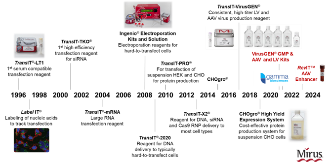 為什么Mirus TransIT-X2? Dynamic Delivery System有著如此高性能及廣泛適應(yīng)性呢?這歸因于Mirus強(qiáng)大且高效的專利遞轉(zhuǎn)平臺設(shè)計(jì),可進(jìn)行多重、多功能組合的轉(zhuǎn)染試劑組分篩選并優(yōu)化。成立于1995年的Mirus,專注及深耕核酸遞轉(zhuǎn)領(lǐng)域多年(圖1),從最早具有低毒性的TransIT ? -LT1到GMP級別、可用于AAV和LV生產(chǎn)的TransIT-VirusGEN?,都是基于該遞轉(zhuǎn)平臺進(jìn)行設(shè)計(jì)及開發(fā)的。截至目前,使用Mirus產(chǎn)品發(fā)表文章已超過1萬篇,并且發(fā)表文章及Mirus數(shù)據(jù)庫涵蓋了超過1200種細(xì)胞類型,更多文章及數(shù)據(jù)查詢,請點(diǎn)擊這里。