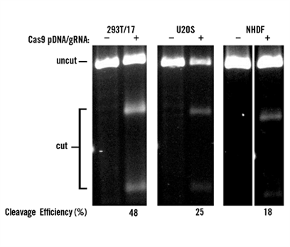 使用TransIT-X2? Dynamic Delivery System? (2 μl/孔,24孔板, Mirus Bio)共轉(zhuǎn)染0.5 μg質(zhì)粒DNA(表達(dá)Cas9蛋白)及50nM 2-part gRNA (PPIB基因)至HEK293T/17, U2OS 及NHDF細(xì)胞中,轉(zhuǎn)染后48小時(shí),T7E1驗(yàn)證切割效率。