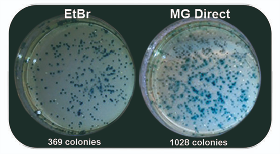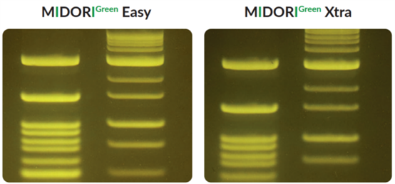 紫外光與EtBr染色至今仍一起被用于分子生物學(xué)實(shí)驗(yàn)室中檢測核酸。然而紫外光譜會導(dǎo)致DNA樣品的修飾和降解,30秒的紫外線曝光足以大幅降低克隆效率。藍(lán)/綠LED在470 nm - 520 nm處發(fā)出安全可見光,這種光譜對 DNA 沒有破壞性,與紫外光相比,DNA完整性和克隆/測序效率完全不受影響,即使在長時(shí)間的光照下也是如此。MIDORIGreen系列核酸染料經(jīng)過優(yōu)化,可在紫外光或藍(lán)/綠光激發(fā)時(shí)獲得更亮的信號,同時(shí)也兼容紫外光。