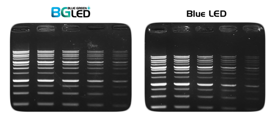 圖3:使用MIDORI Green Xtra檢測的DNA條帶具有超高靈敏度(注:左圖使用藍(lán)色/綠色 LED 透射儀進(jìn)行檢測;右圖使用藍(lán)色LED透射儀進(jìn)行檢測。)