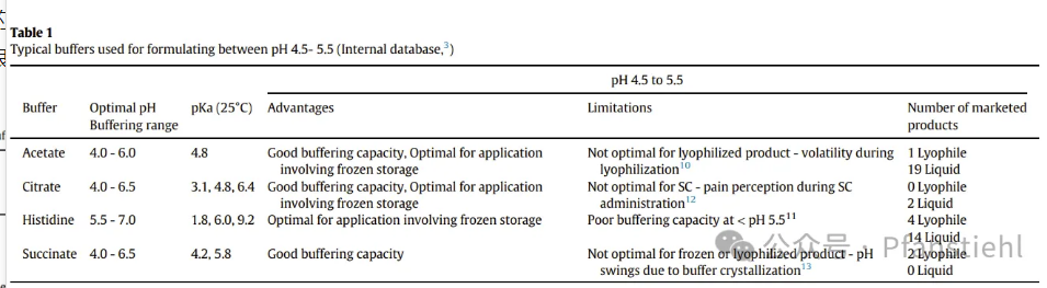 盡管在液體和凍干產(chǎn)品中,組氨酸在pH 5.5至6.5的范圍內(nèi)都占據(jù)主導(dǎo)地位,但如果目標(biāo)pH值在4.5至5.5之間,我們依然還有另外三種緩沖液可選,即醋酸鹽、檸檬酸鹽和琥珀酸鹽。這些緩沖物質(zhì)存在某些固有的挑戰(zhàn),阻礙了它們在靜脈和皮下給藥以及液體和凍干劑型方面的廣泛使用。而組氨酸的pKa值為6,在pH<5.5時緩沖性較差,因此在4.5至5.5的pH范圍內(nèi)應(yīng)用有限。雖然醋酸鹽在此范圍內(nèi)具有良好的緩沖能力,但其易揮發(fā)和冷凍干燥過程中溶劑的過度損失是其應(yīng)用相關(guān)的潛在挑戰(zhàn)。檸檬酸鹽緩沖制劑在皮下應(yīng)用中使用有限,原因是在皮下注射期間存在壞死的風(fēng)險。琥珀酸鹽在pH4.5至5.5之間提供了強(qiáng)大的緩沖能力,但由于琥珀酸鹽結(jié)晶影響產(chǎn)品穩(wěn)定性而導(dǎo)致pH值劇烈波動的風(fēng)險,通常避免其用于冷凍或凍干的應(yīng)用。以下表格總結(jié)了在注射制劑中使用這四種緩沖液的局限性[1]。