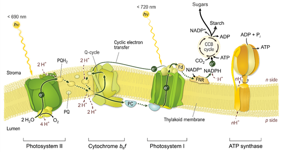植物光合作包括光能的吸收、能量轉(zhuǎn)換、電子傳遞、ATP的合成以及CO2的固定等步驟,這一過程主要在植物的葉綠體的類囊體膜上完成的。類囊體膜上存在四種關(guān)鍵的蛋白復(fù)合體:光系統(tǒng)II(PS II)、Cytb6/f復(fù)合體、光系統(tǒng)I(PS I)和ATP合成酶,這四種復(fù)合體協(xié)同作用,共同完成光反應(yīng)。光系統(tǒng)II上具有捕光色素復(fù)合體(LHC)構(gòu)成的天線系統(tǒng),可以捕獲光能,而光系統(tǒng)I則利捕獲后的能量進(jìn)行原初光化學(xué)反應(yīng)。Cytb6/f復(fù)合體在電子傳遞過程中起著至關(guān)重要的作用,ATP合成酶則負(fù)責(zé)合成ATP,為植物細(xì)胞提供能量。
