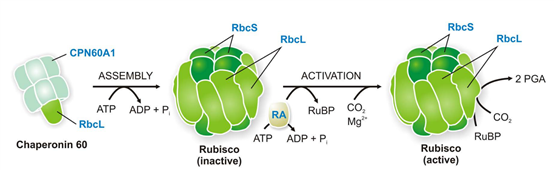 CO2的固定是利用光反應(yīng)產(chǎn)生的ATP和NADPH合成有機(jī)物的過程,該過程稱為卡爾文循環(huán)。1,5二磷酸核酮糖羧化/加氧酶(Rubisco)是CO2固定過程中的關(guān)鍵限速酶,催化CO2和RuBP(核酮糖-1,5-二磷酸)發(fā)生羧化、然后裂解形成兩個(gè)PGA(甘油酸-3-磷酸)分子。所有光合生物都具有由8個(gè)大亞基RbcL和8個(gè)小亞基Rbcs組成的I型Rubisco,且RbcL折疊到其天然狀態(tài)依賴于葉綠體定位的分子伴侶CPN60的作用。