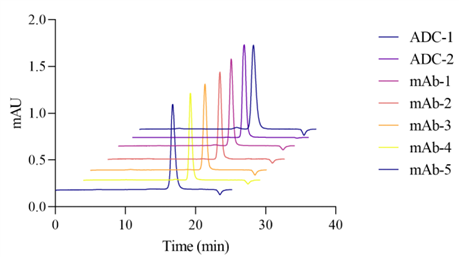 圖4. 5種單克隆抗體與2種抗體偶聯(lián)藥物在低濃度下進樣的SEC色譜圖