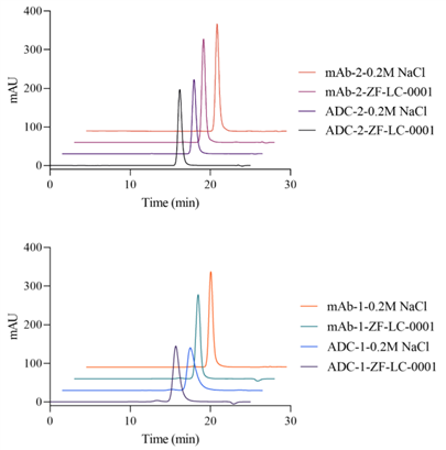 圖5. 使用ZF-LC-0001與常規(guī)高鹽流動相的SEC色譜圖對比(樣品分別為2種mAb與2種ADC藥物)