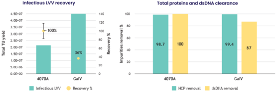 - LentiHERO®具備強大的雜質(zhì)去除能力,在不影響載體功能的情況下可去除>98%的HCP及>87%的dsDNA殘留