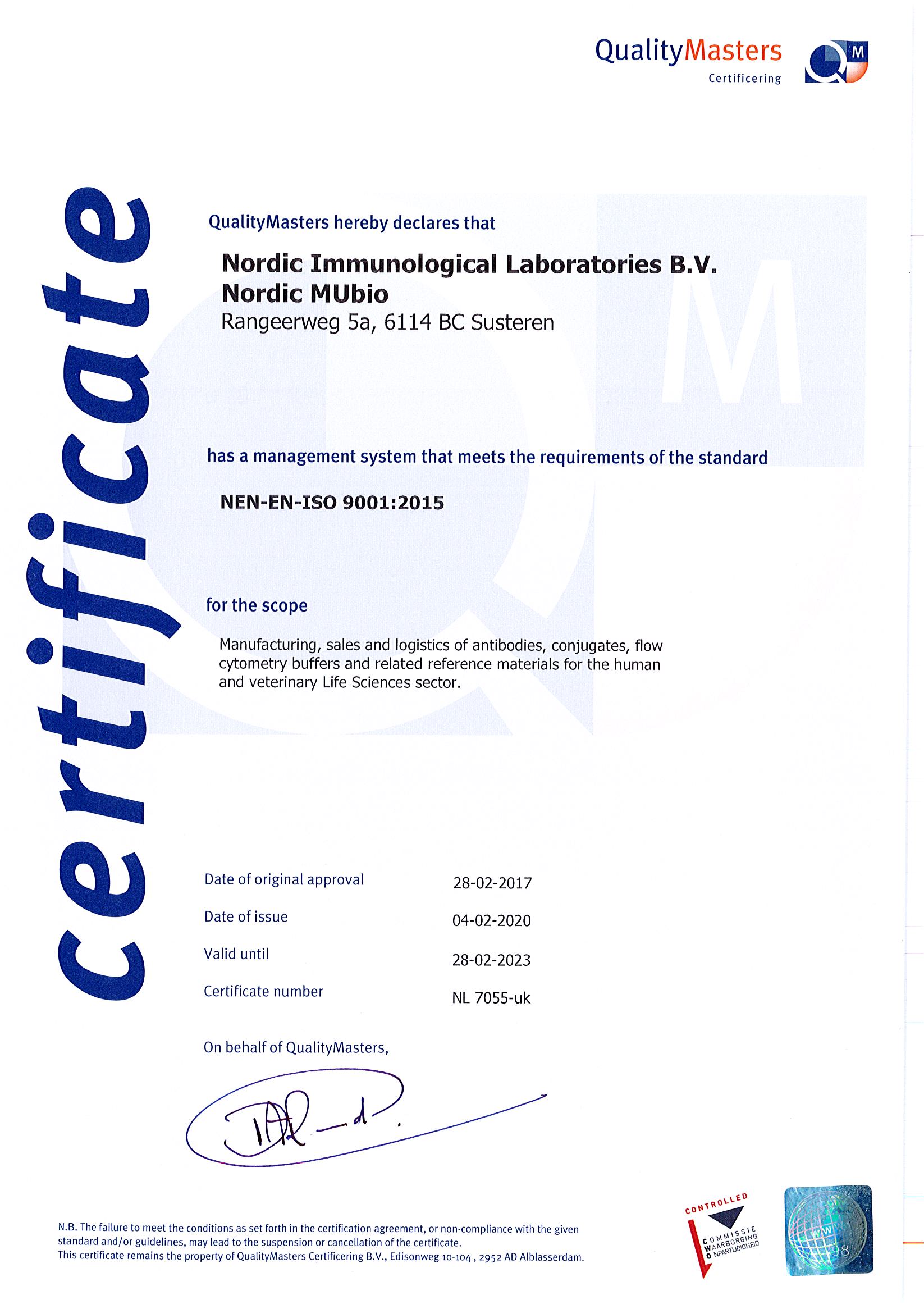 Nordic-MUbio公司供應(yīng)2000多種用于生物醫(yī)學(xué)和獸醫(yī)研究的基礎(chǔ)免疫學(xué)試劑,包括抗血清、抗體、免疫復(fù)合物、純化蛋白、對(duì)照品、血清蛋白標(biāo)準(zhǔn)品和其他校準(zhǔn)品。他們包括高度特異性的單克隆抗體,以及用于不同試驗(yàn)體系的標(biāo)記二抗。Nordic-MUbio嚴(yán)格遵守IS09001標(biāo)準(zhǔn)生產(chǎn)高質(zhì)量的抗體,80%以上的抗體經(jīng)過(guò)冷凍組織免疫組化檢測(cè),近70%的產(chǎn)品通過(guò)流式細(xì)胞術(shù)驗(yàn)證,50%的產(chǎn)品通過(guò)WB驗(yàn)證。同時(shí)Nordic-MUbio也是斑馬魚(yú)抗體開(kāi)發(fā)的引領(lǐng)者,擁有50多種可用于斑馬魚(yú)熒光檢測(cè)的抗體。Nordic-MUbio的核心優(yōu)勢(shì)在于每一個(gè)單項(xiàng)產(chǎn)品都提供及時(shí)的技術(shù)支持并擁有廣泛的科學(xué)數(shù)據(jù)、圖片和文獻(xiàn)參考資料。